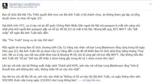 Tuy nhiên, một nguồn tin thân cận với Bùi Anh Tuấn lại phủ nhận hoàn toàn những thông tin mà hot blogger kia đưa ra. Nguồn tin này cho hay: "Đúng là ban tổ chức cành cọ Vàng có liên hệ với Bùi Anh Tuấn về việc biểu diễn vào ngày 3/3. Thế nhưng cũng là người nắm được thông tin, tôi xin khẳng định không hề có chuyện Bùi Anh Tuấn nhận show của Cành Cọ Vàng. Về phía đại diện ban tổ chức, người trực tiếp book show người ta còn đang cảm ơn ekip của Bùi Anh Tuấn vì đã giúp book Hoàng Thùy Linh sau khi Tuấn từ chối tham gia".